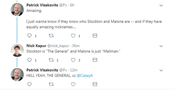 网友“Patrick Vlaskovits”:我很好奇他们知不知道斯托克顿和马龙是谁,以及他们有没有足够赞的绰号?