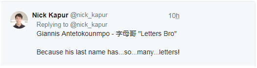 为什么中国球迷要叫他“字母哥”呢?尼克说,因为他的姓(Antetokounmpo)。。。实在是太多字母了!