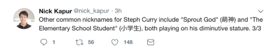 尼克在他的推特中介绍到,库里的其它绰号包括“萌神”和“小学生”,这俩绰号都玩的是他身材娇小的梗。。。