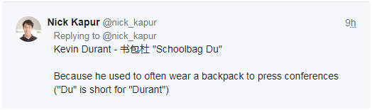 “书包杜”杜兰特。这是因为他以前经常背着背包去举行新闻发布会。尼克还贴心地告诉美国民众,“杜”是“杜兰特”的简称。