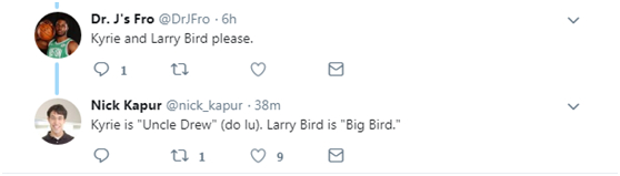 尼克:凯里是“德鲁大叔”;拉里·伯德是“大鸟”。