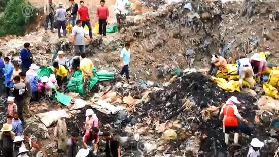 从观众提供的视频中可以看到,上百村民聚集在金平县金河镇的一处垃圾填埋场里,把已经填埋进垃圾场的走私冻肉一箱箱地挖了出来。路面上到处散落着包装破损后掉出的鸡脚。