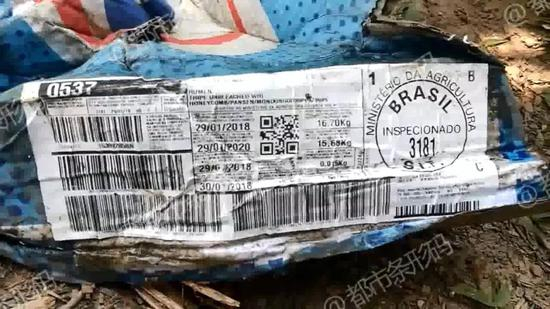 垃圾堆里已经没有了填埋时完整的走私冻品,散落的纸盒均已被损坏。外包装上的标识显示,货品为鸡翅和牛肉冻品。