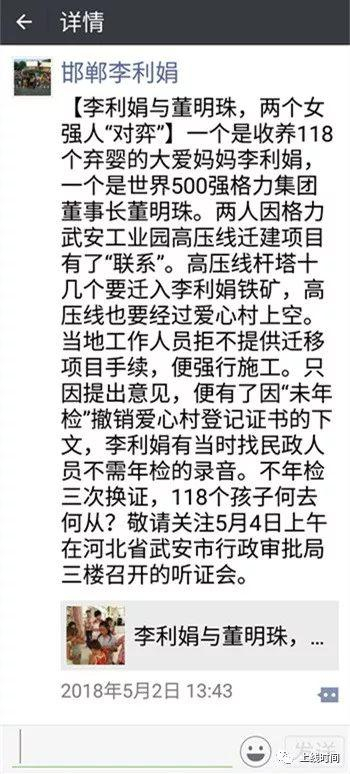 在被抓之前,她在朋友圈里还转发了律师殷清利的微博文章,称“一个是收养118个弃婴的大爱妈妈李利娟,一个是世界500强格力集团董事长董明珠,两人因格力武安工业园高压线迁建项目有了‘联系’”,将爱心村被取缔的矛头直指武安引入的千亿项目——格力·邯郸(武安)中原智能装备基础件产业基地。