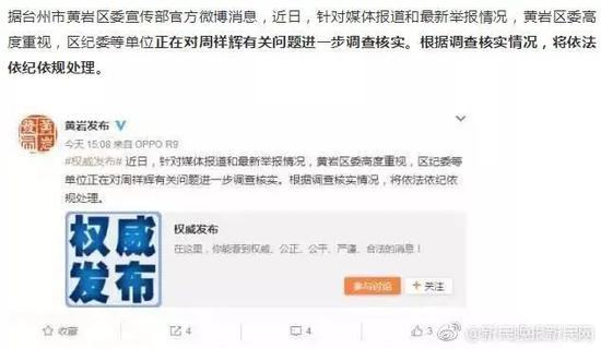 今天,黄岩发布微信公号披露:经浙江省台州市黄岩区委同意,黄岩区纪委已决定对周祥辉的违纪问题予以党纪立案审查。同时,黄岩区委决定暂停周祥辉履行职务。