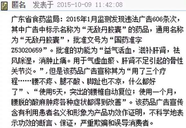广东省食药监局:2015年1月监测发现,“无敌丹胶囊”药品广告宣传,含有利用患者名义和形象为产品功效作证明,不科学地表示功效的断言、保证,严重欺骗和误导消费者。