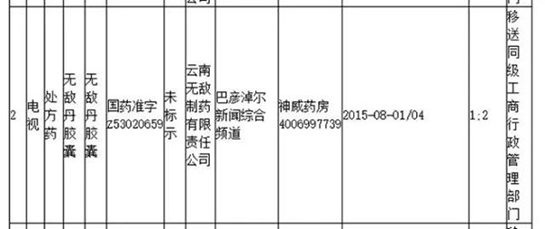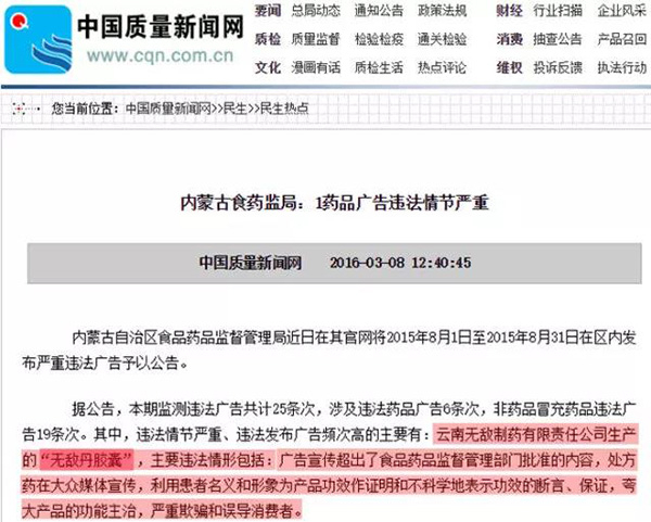内蒙古食药监局:发布的2015年8月1日至2015年8月31日严重违法广告公告显示,“无敌丹胶囊”广告宣传超出食品药品监督管理部门批准内容,处方药在大众媒体宣传,利用患者名义和形象为产品功效作证明和不科学地表示功效的断言、保证,夸大产品的主治功能,严重欺骗和误导消费者。处理结果是“移送同级工商行政管理部门”。