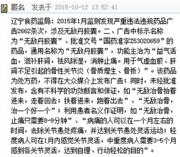辽宁食药监局:2015年1月监测发现,“无敌丹胶囊”为处方药,不得在大众媒介上发布广告;同时,未经批准发布,含有不科学的功效断言和保证;利用患者名义作证明。