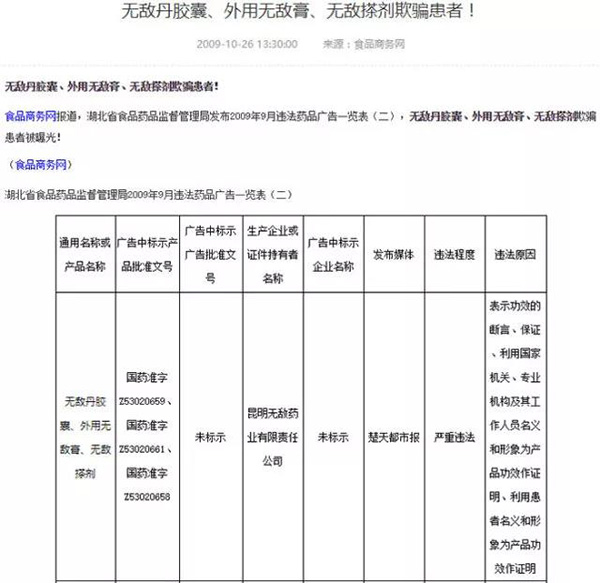 在湖北省食药监局发布2009年9月违法药品广告一览表(二)中,无敌丹胶囊(国药准字Z53020659)、外用无敌膏(国药准字Z53020661)、无敌搽剂(国药准字Z53020658)等3种药,因表示功效的断言、保证,利用国家机关、专业机构及其工作人员名义和形象为产品功效作证明,利用患者名义和形象为产品功效作证明,严重违法,欺骗患者被曝光!