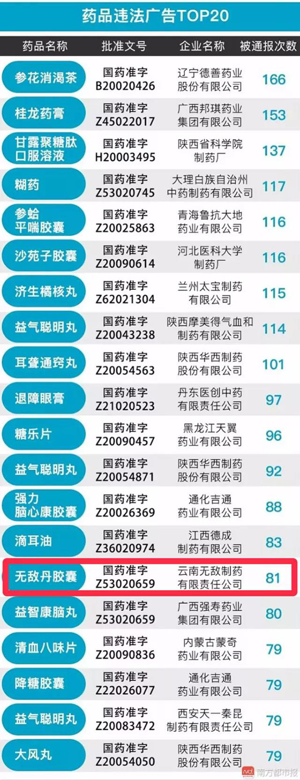 在药品违法广告TOP20的榜单中,春城晚报发现云南无敌丹胶囊赫然在列。且被通报次数多达81次!位列第15位。该数据统计日期是2001年—2018年4月。