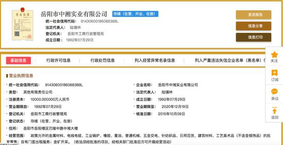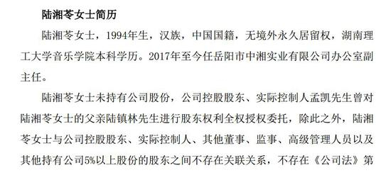 而工商资料显示,中湘实业的实际控制人与执行董事名为陆镇林,而陆镇林正是陆湘苓的父亲。