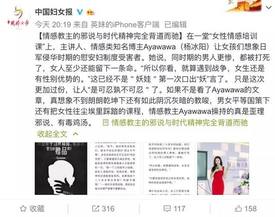 @中国妇女报 微博称,如果不是看了Ayawawa的文章,真想象不到朗朗乾坤下还有如此阴沉灰暗的教唆,男女平等国策下还有把女性往尘埃里踩踏的课程,情感教主Ayawawa操持的真是歪理邪说、有毒鸡汤。