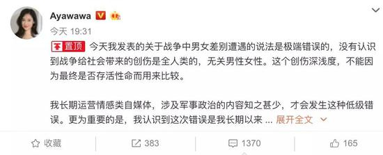 就在这时,Ayawawa发微博,道歉并置顶。
