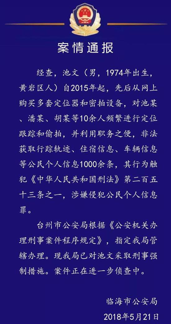 经查,池文(男,1974年出生,黄岩区人)自2015年起,先后从网上购买多套定位器和密拍设备,对池某、潘某、胡某等10余人频繁进行定位跟踪和偷拍,并利用职务之便,非法获取行踪轨迹、住宿信息、车辆信息等公民个人信息1000余条,其行为触犯《中华人民共和国刑法》第二百五十三条之一,涉嫌侵犯公民个人信息罪。
