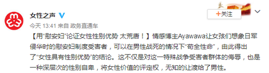 中华全国妇女联合会官方微博@女性之声 5月22日发文指出,情感博主Ayawawa让女孩们想象日军侵华时的慰安妇制度受害者,可以在男性战死的情况下“苟全性命”,由此得出了“女性具有性别优势”的结论。这不仅是对这一特殊战争受害者群体的侮辱,也是一种深层次的性别自卑,将女性价值的评定权,无知的让渡给了男性。