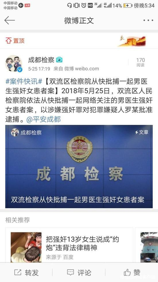 记者从成都市人民检察院官方微博获悉,2018年5月25日,成都市双流区检察院依法从快批捕一起网络关注的男医生强奸女患者案,以涉嫌强奸罪对犯罪嫌疑人罗某批准逮捕。