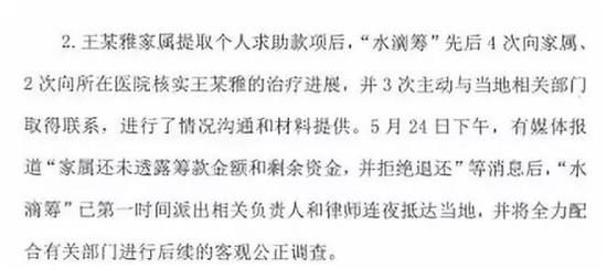 水滴筹也发布官方声明:声明称从平台可公开的信息系统数据显示,小雅家属实际筹得款项35689元……