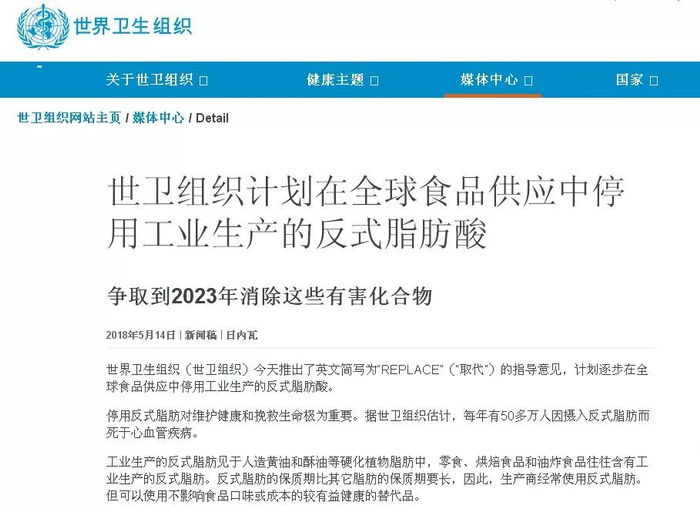 5月14日,世界卫生组织呼吁各国5年内彻底消除食品中的人造反式脂肪。