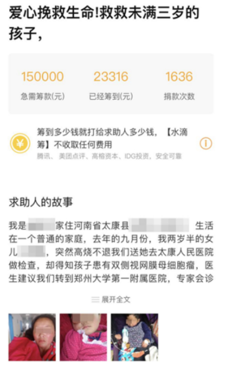 去年9月,2岁半小凤雅患视网膜母细胞瘤,其母杨美芹在水滴筹、火山小视频等多个平台筹集资金,引发关注。在其中一条募捐视频中,小凤雅艰难地转向妈妈的镜头,喊了一声“救我”。随后,在善心人士的帮助下,救助小凤雅的到账款项达到了3万元。