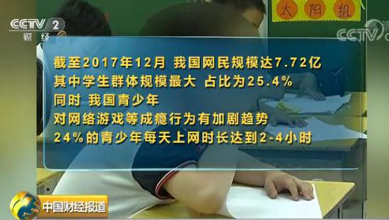 数据显示,截至2017年12月,我国网民规模达7.72亿,其中学生群体规模最大,占比为25.4%。同时,我国青少年对网络游戏等成瘾行为有加剧趋势,24%的青少年每天上网时长达到2-4小时。