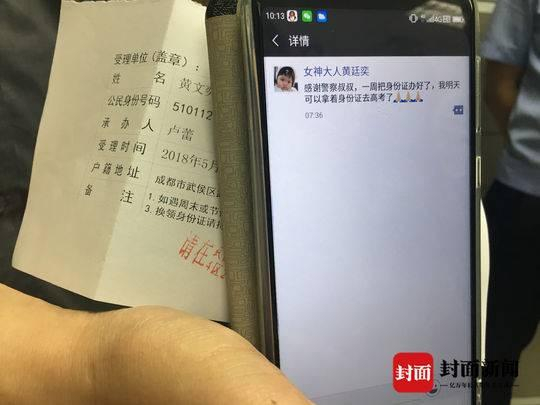 6日早上10点半,在接到民警通知后,黄先生来到了武侯区政务中心,帮女儿取到了补办好的身份证,整个补办过程仅花费9天时间。“确实没想到这么快,我们一般办身份证都要一个月。”黄先生说,在得知身份证已经办好后,女儿小黄一早还专门在朋友圈发了一条消息感谢提供帮助的民警。“感谢警察叔叔,一周把身份证办好了,我明天可以拿着身份证去高考了”。