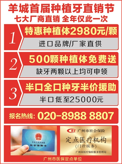 目前,2018羊城首届种植牙直销节正在火热进行中,全球7大种植体厂商以厂家直供的模式,针对半口、全口、多颗缺牙市民开展专项援助,吸引了众多缺牙市民的报名参与。活动期间,半口、全口缺牙市民可享半价援助,半口种牙低至25000元,直销节专供特惠进口种植体2980元/颗,瑞士ITI种植体每颗直减6000元。据悉,惠民补贴即将结束,缺牙市民需抓紧机会,报名电话:(020)89888807。 文/席勒