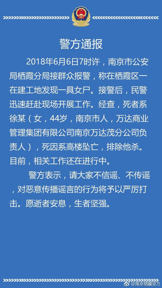 2018年6月6日7时许,南京市公安局栖霞分局接群众报警,称在栖霞区一在建工地发现一具女尸。接警后,民警迅速赶赴现场开展工作。经查,死者系徐某(女,44岁,南京市人,万达商业管理集团有限公司南京万达茂分公司负责人),死因系高楼坠亡,排除他杀。目前,相关工作还在进行中。