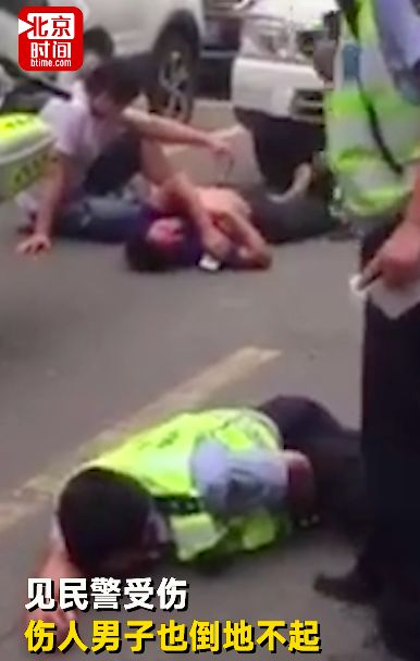 而见民警受伤倒地,伤人男子竟也“倒地不起”。