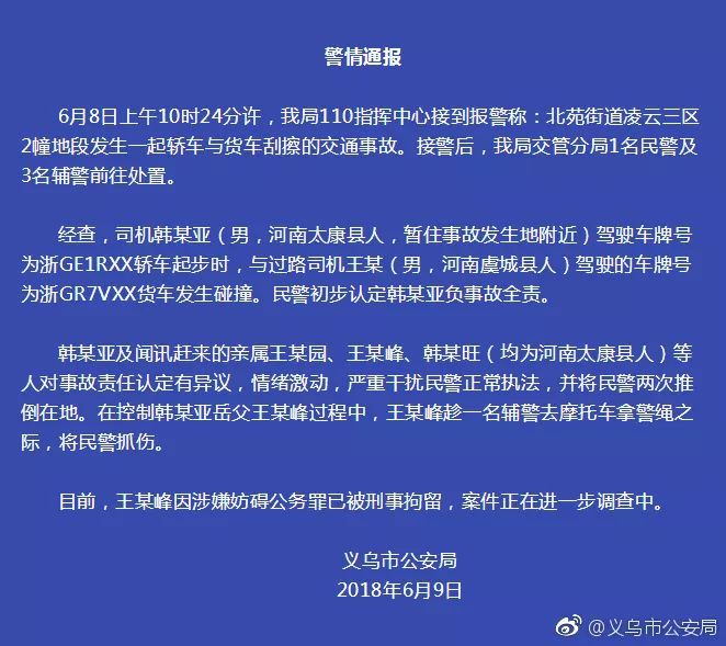 6月9日,义务公安局发布通报称,当时一轿车和一货车发生剐蹭,交警认定轿车司机负全责。轿车司机及家属对处理结果不满,因此干扰民警正常执法。