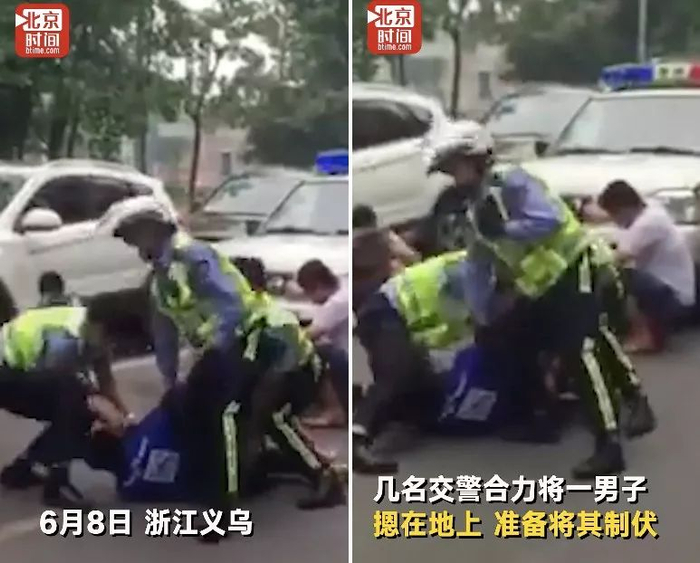 6月8日,在浙江义乌一道路中央,3名交警合力将一名男子按在地上,准备将其制伏。