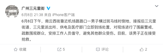 6月8日下午,南云西街靠近机场路路口一男子横过斑马线时倒地,接报后三元里街道、三元里派出所、供电及医疗部门立即到场处置,对现场进行了围蔽警戒,疏散围观群众,安排工作人员值守,避免其他群众受伤。