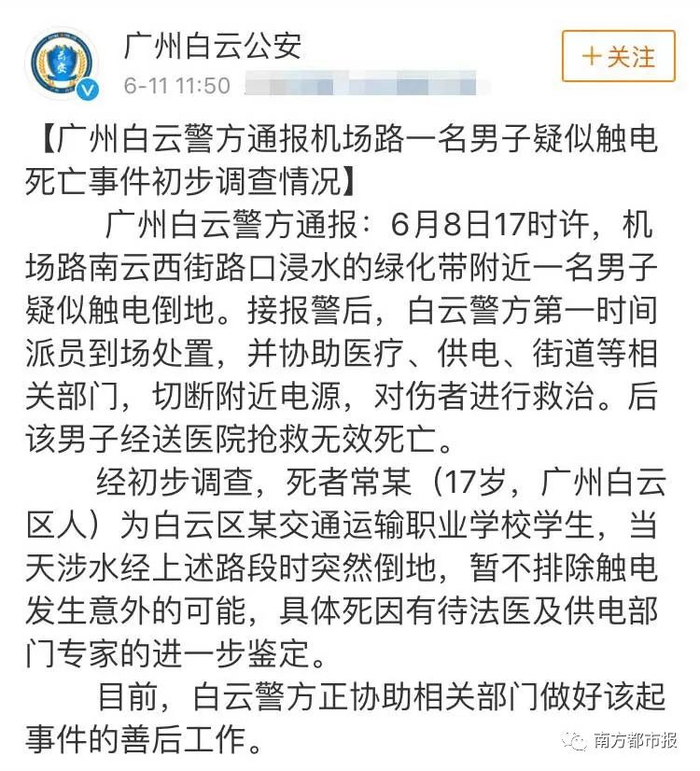 广州白云警方今早11:50发布通报:暂不排除触电发生意外的可能,具体死因有待法医及供电部门专家的进一步鉴定。