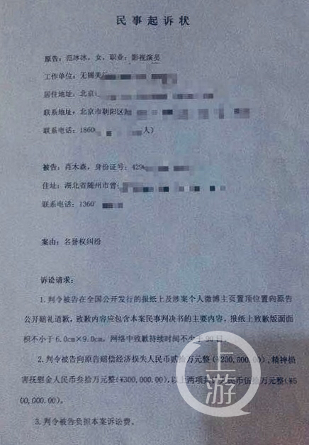 此外,上游新闻记者了解到,发布同样的“范冰冰私生子”传言,也有人遭遇起诉,诉状内容均是类似的版本。