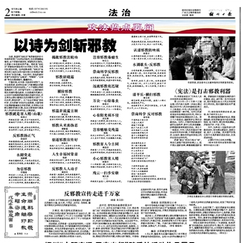 5月2日,《梧州日报》以大版面发表了《以诗为剑斩邪教》广西梧州诗人的作品,在市民中引起热烈反响。