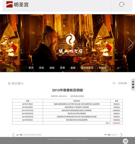 12日下午上述截图在网上流传,澎湃新闻随即在明圣宫官网上进行了核实,该账目明细确为该官网发布,发布时间为2016年5月16日。此外,该网站还发布了此前几年的慈善账目明细,慈善项目多为资助贫困学生、捐建学校、道观等等。