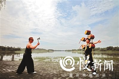 据了解,目前重庆范围内少有飞斧项目,即便在全国也不多见。“从小都很不安分,喜欢翻筋斗,倒立走。”老谢说,与生俱来的杂技天赋,一次偶然的机会,他得到了杂技老师郭万新的赏识。8岁时,他正式拜师学艺,成为了双桥杂技的第四代传承人。靠杂技谋生的三十多年,老谢的头部和手掌布满了茧子。“学杂技,哪没有磕磕绊绊,摔得鼻青脸肿是家常便饭。”老谢很粗犷,丝毫不在意身上的伤疤。