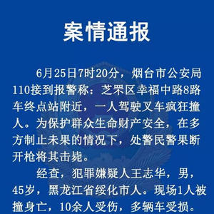 视频在自媒体广泛流传,震惊公众。烟台警方在通报中称,“为保护群众生命财产安全,在多方制止未果的情况下,处警民警果断开枪将其击毙”,事件中1人被撞身亡,10余人受伤,多辆车受损;犯罪嫌疑人叫王志华,男,45岁,黑龙江省绥化市人。