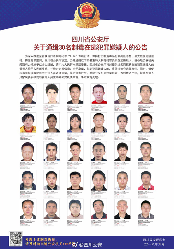 原标题:四川省公安厅发布30名重特大制毒犯罪在逃嫌疑人公告