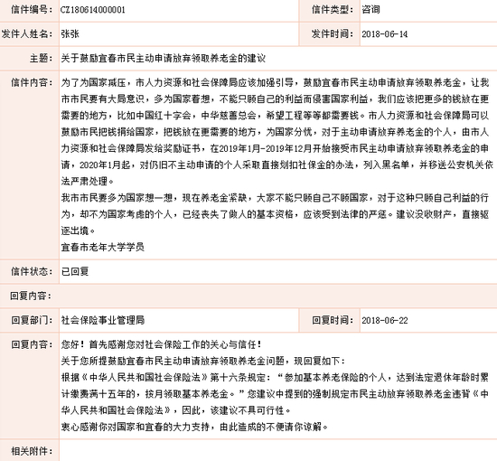 原标题:宜春市民提议:鼓励市民主动申请放弃领取养老金