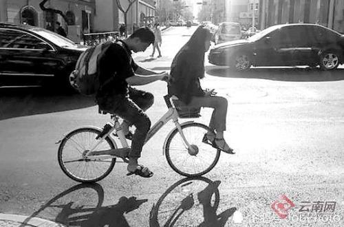 共享单车屡现“花式”载人:女孩骑男友肩头(图)