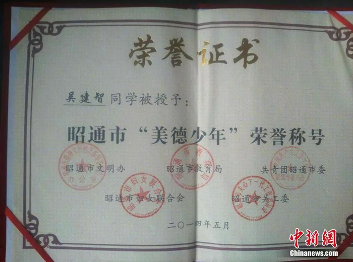 弟弟吴建智的荣誉证书。巧家县第三中学老师供图