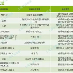 此次,上海市消保委家电专业办联合徐汇区消保委,根据消费者的消费习惯,挑选了360、百度、家电报修一线通、962512、114、大众点评、58同城、淘宝、苏宁、国美、京东等11家平台作为体察对象,涉及互联网平台8家、电话查询平台3家,以平台搜索排名靠前的空调维修服务商作为体察对象,相关商户有相当一部分还是平台的推广企业。