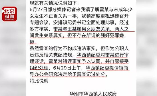 6月30日,华西镇政府发布说明称,雷某与当事少女王某系情侣关系,王某已超过14周岁,不存在所谓强奸犯罪嫌疑,警方不予立案。
