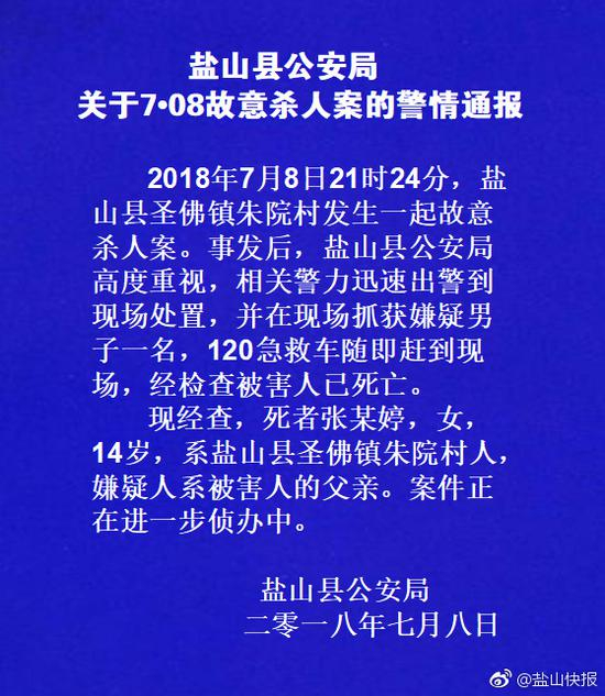 7月8日,在河北沧州盐山县圣佛镇朱院村,一14岁女少遇害,盐山县公安局当日发出警情通报称,嫌犯系该少女的父亲,当场被抓获。案件正在进一步侦办中。