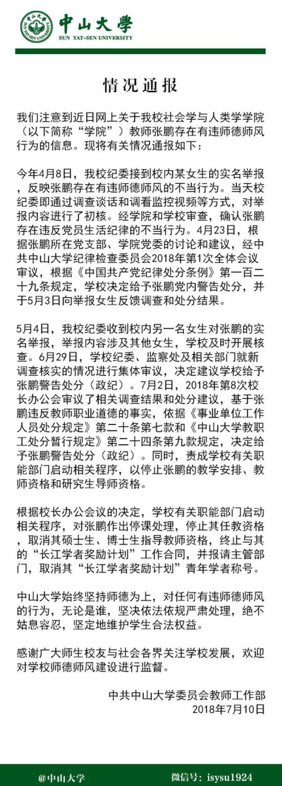 原标题:中山大学通报:停止张鹏任教资格,报请取消其长江学者称号