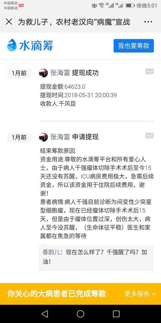 随后,千强的家人又通过“水滴筹”平台,申请了募捐并通过了审核。
