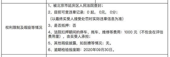 答:在竞拍网站(北京产权交易所网站,进入北京法院京牌小客车司法处置平台)中,每辆车的详细信息里可查车辆“权利限制及瑕疵等情况”。