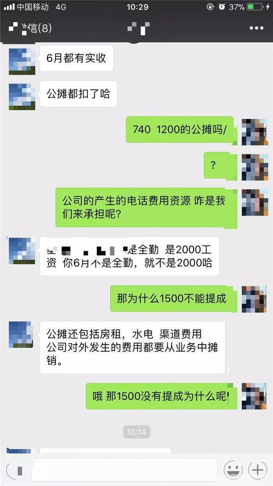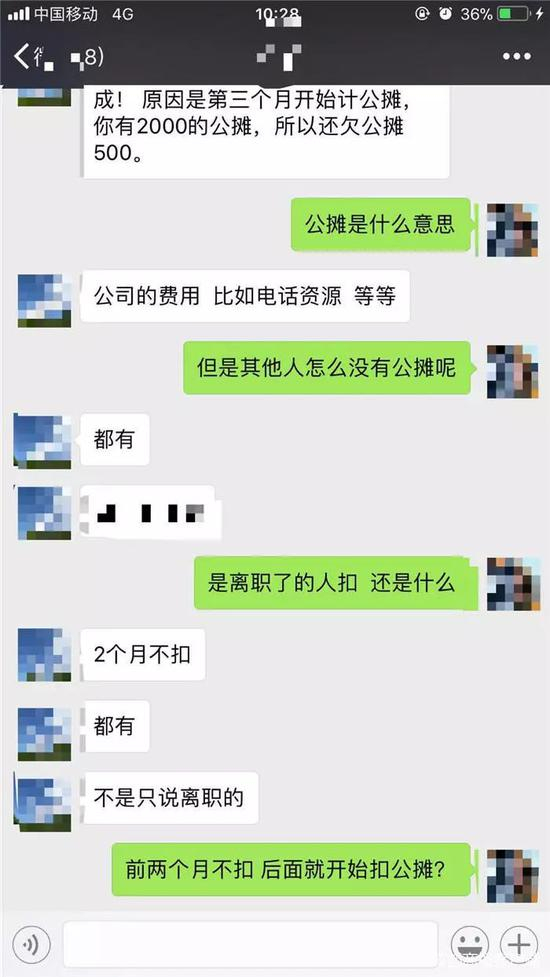 但张小慧向记者展示了与财务的聊天截图,对方却表示:“6月你收了1500元回来,没有提成!原因是第三个月开始计公摊,你有2000(元)的公摊,所以还欠公摊500(元)。”