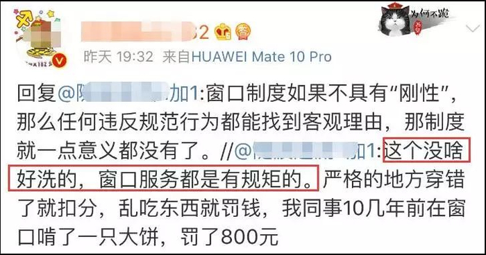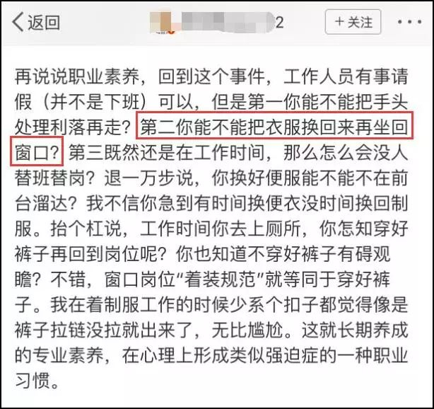 据这位博主介绍,照片是他在某个聊天群里看到的,当下觉得“这个工作人员非常不专业,穿成这样坐在窗口里,实在有碍观瞻”。微博发出后,有网友在评论中提醒事出有因,博主才补充了事情的情况说明。