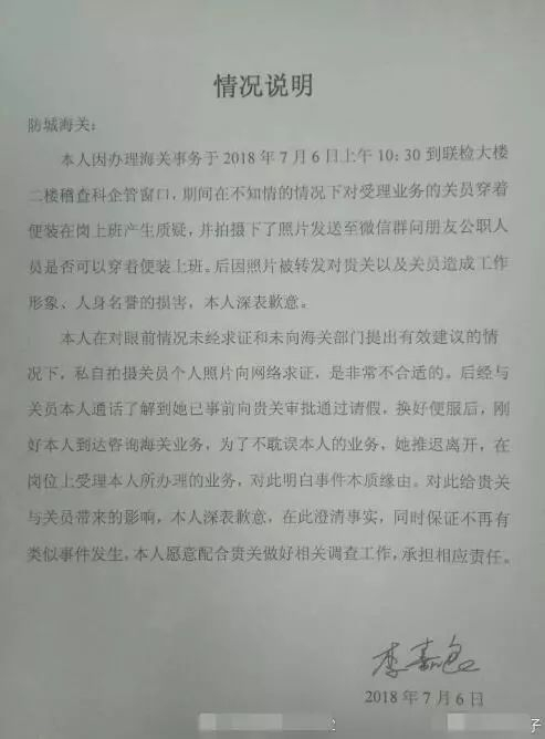 原来这名女性工作人员,当天已请假,准备离开时,恰逢有人前来办事。为了不耽误对方,她临时受理了业务。没想到,因着装问题被拍照晒到了网上……